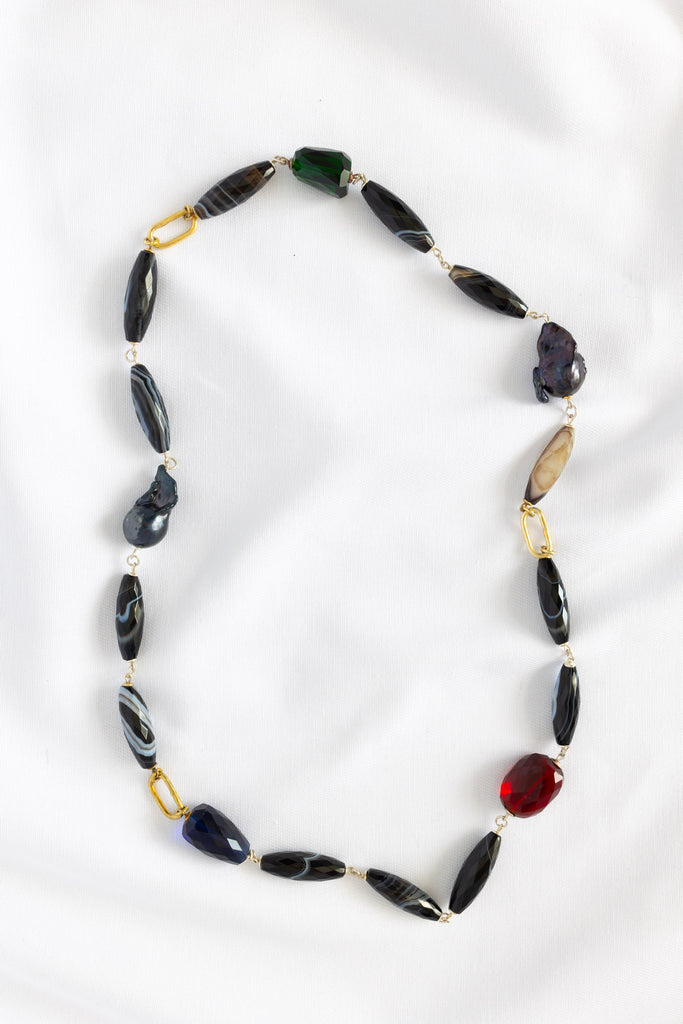 Czarny agat, kwarc barwiony, perła biwa, srebro, elementy srebrne ręcznie robione.