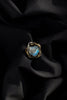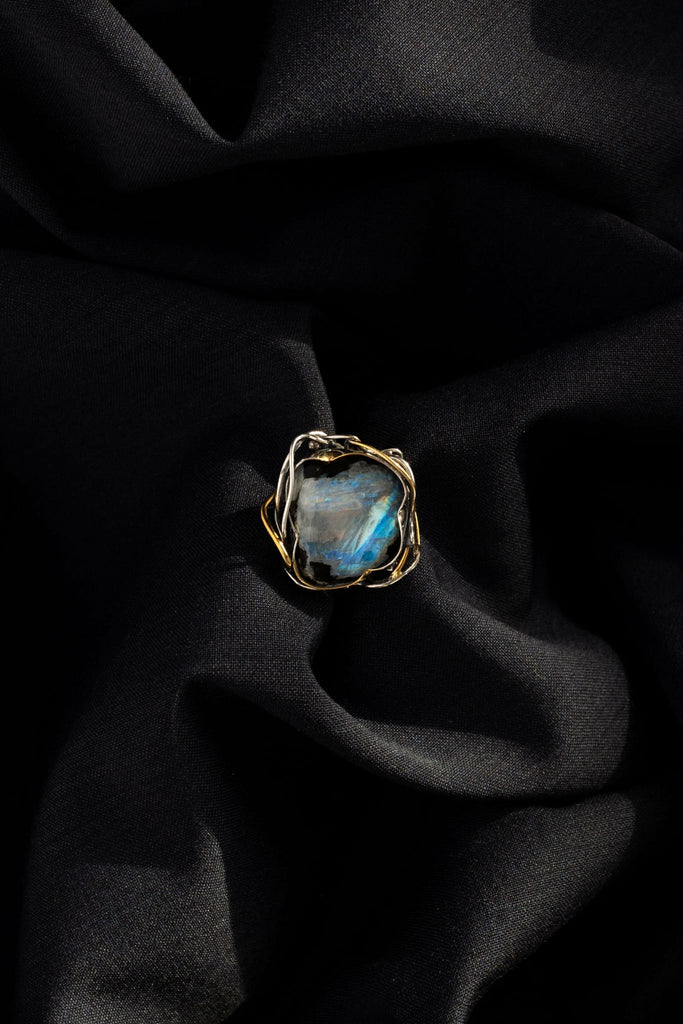 Kamień Księżycowy, srebro oksydowane i pozłacane, oprawa ręczna.
